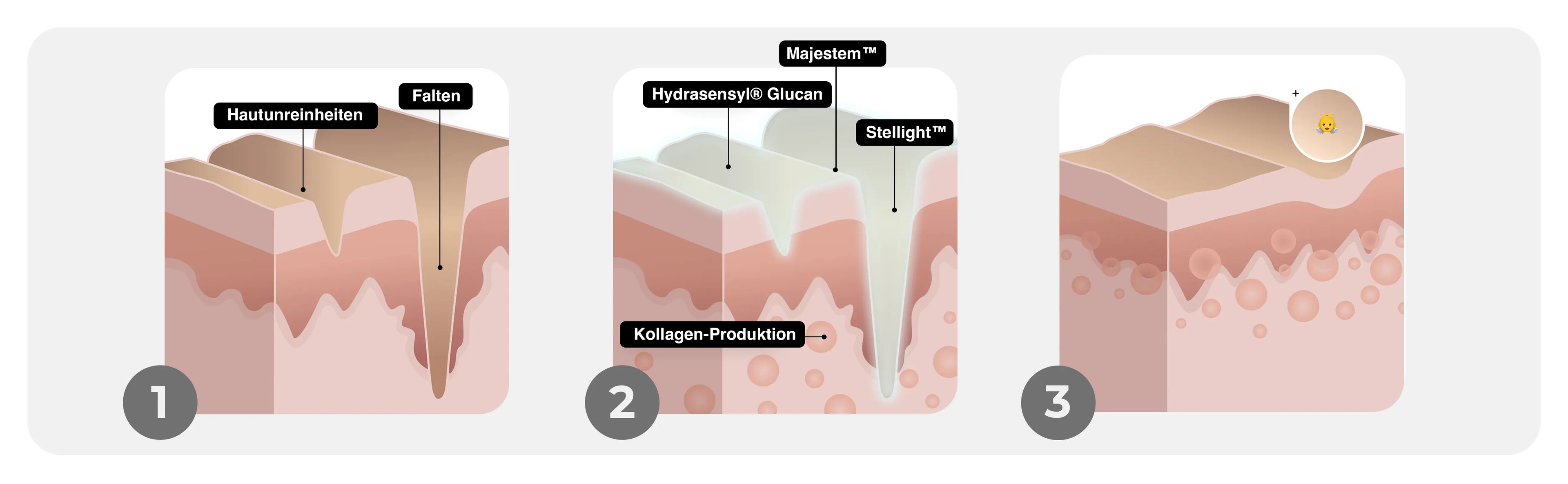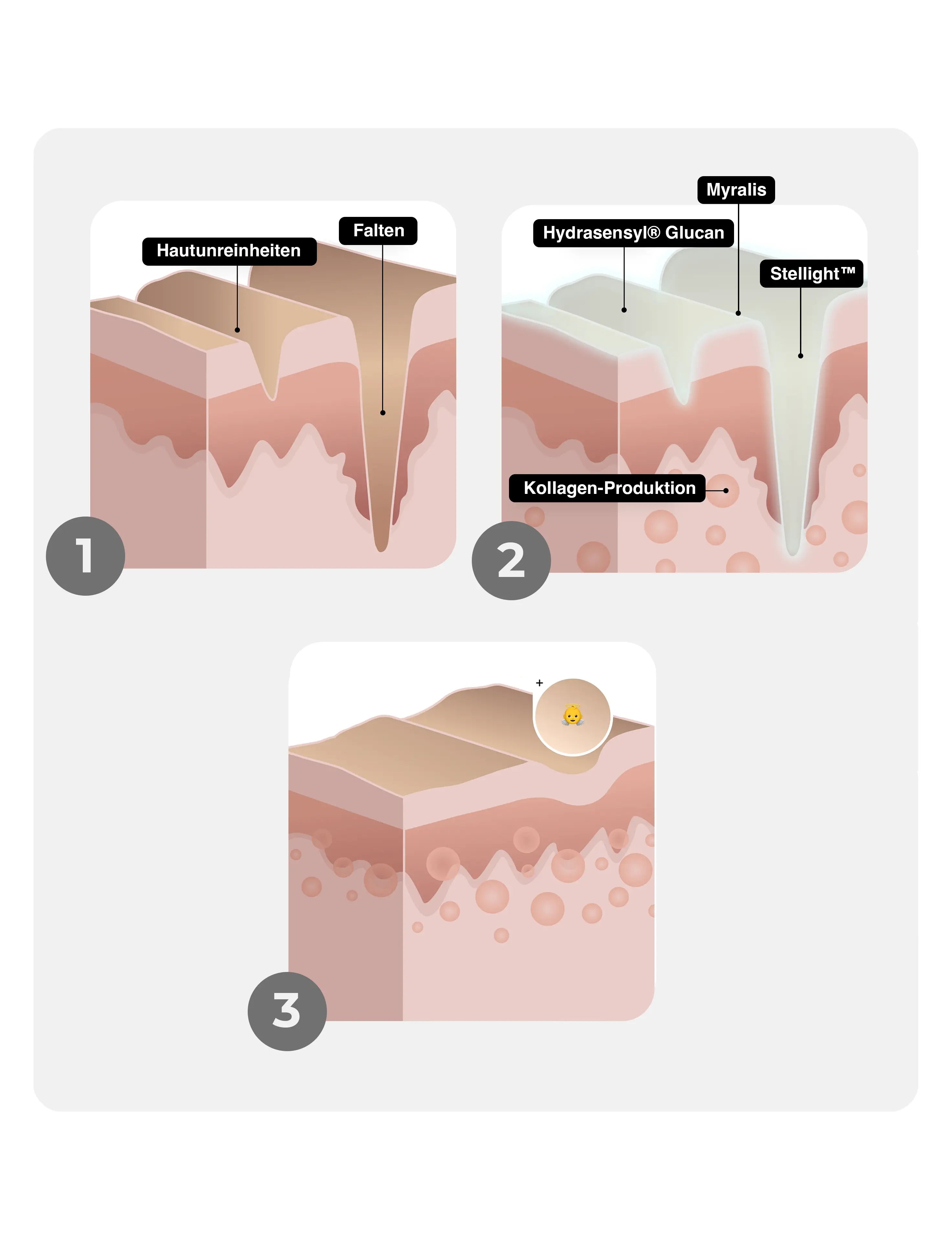 Sie wirkt in der Tiefe der Haut, stimuliert die Zellerneuerung, erhöht die Elastizität und regt die Produktion von Kollagen an, was zu einer verbesserten Hautstruktur und einem jugendlicheren Erscheinungsbild führt.